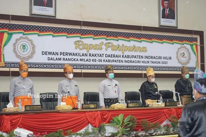 INHIL, TEMBILAHAN, - Dalam rangka memperingati Milad Ke-56 Kabupaten Indragiri Hilir (Inhil), Dewan Perwakilan Rakyat Daerah (DPRD) menggelar Rapat Paripurna, Senin (14/6/2021), Bupati HM Wardan hadir dalam Milad Kabupaten Inhil ke 56 tahun 2021 itu.
