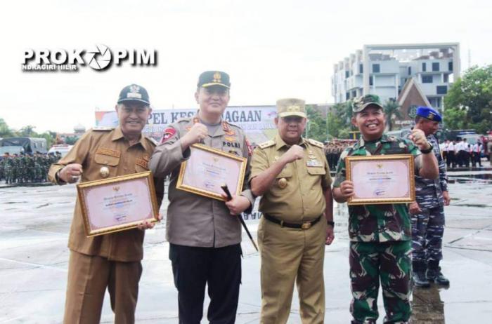 Usai apel Wagubri Brigjen TNI (Purn) Edy Natar Nasution menyerahkan penghargaan kepada Pemda Kabupaten Indragiri Hilir atas dukungan dan partisipasinya dalam rangka pencegahan dan penanggulangan kebakaran Hutan dan Lahan di Provinsi Riau yang di Terima Wakil Bupati H.Syamsuddin Uti.