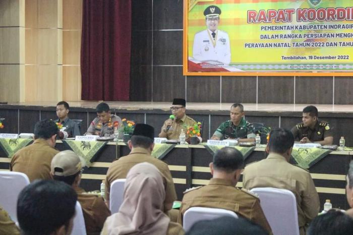 TEMBILAHAN, RIAUONE COM- Pemerintah Kabupaten (Pemkab) Indragiri Hilir (Inhil) menggelar Rapat Koordinasi (Rakor) Bersama Forum Koordinasi Pimpinan Daerah (Forkopimda) Kabupaten Inhil dalam rangka persiapan menghadapi Perayaan Natal Tahun 2022 dan Tahun Baru 2023 (Nataru), Senin (19/12/2022).