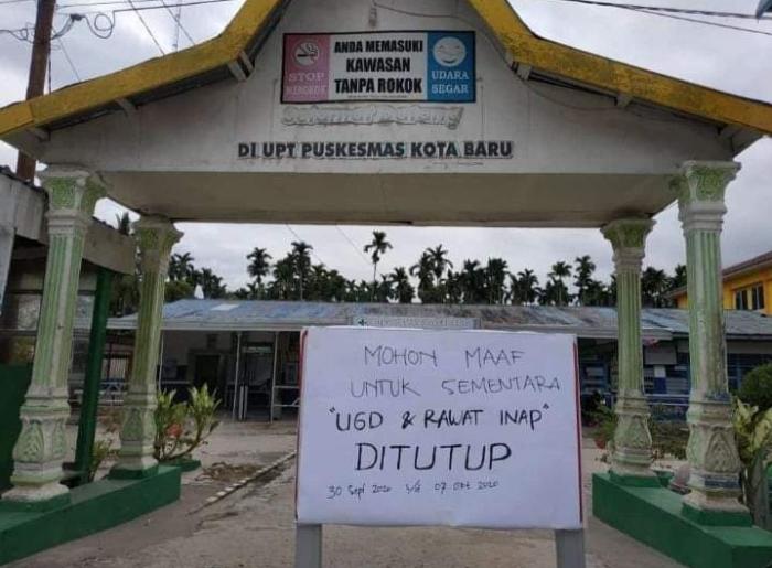 Untuk memutus mata rantai pandemi Corona ini meluas, pelayanan UPT Puskesmas Kota Baru ditutup sementara selama sepekan mulai dari tanggal 30 September hingga 7 Oktober 2020.