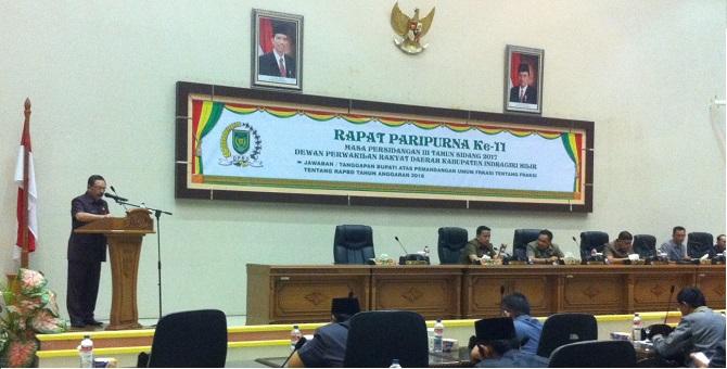 RIAUONE.COM, TEMBILAHAN - DPRD Kabupaten Indragiri Hilir (Inhil) menggelar rapat paripurna ke-11 masa persidangan III tahun sidang 2017, dengan agenda jawaban/tanggapan Bupati atas pemandangan umum Fraksi terhadap RAPBD tahun anggaran 2018, Selasa (21/11/2017).