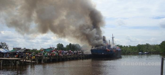 Kapal yang terapung di perairan Sungai Indragiri tak jauh di belakang SPBU Pertamina Parit 4 ini, beberapa kali menyemburkan api beserta suara ledakan.