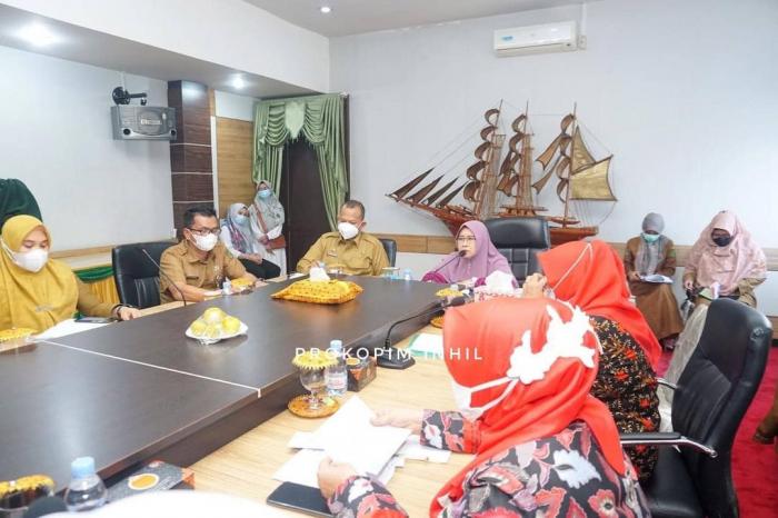 INHIL, - Ketua TP-PKK Inhil Hj Zulaikha Wardan SSos ME Pimpin Rapat Lanjutan Gerakan Satu Hati Jilid II, di Ruang Rapat Kediaman Dinas Bupati Jalan Kesehatan Nomor 1 Tembilahan, Senin (28/6/2021).
