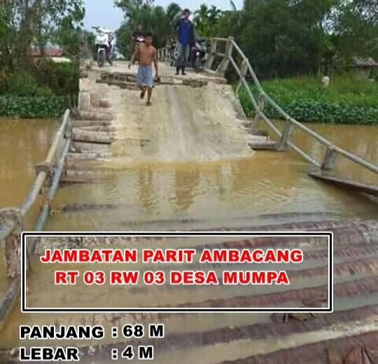 Dua jembatan yang dilaporkan putus sejak, Senin (10/2/2020) itu adalah jembatan Parit Ambacang dan Parit Kajang Desa Mumpa. Agar tetap bisa dilalui, masyarakat setempat terpaksa melakukan perbaikan secara swadaya.
