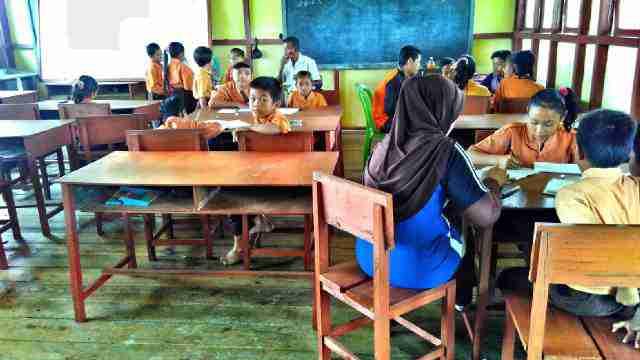 Sekolah yang berjarak kurang lebih 7 Km ini terpaksa menggabungkan seluruh siswanya dari kelas satu sampai kelas enam tanpa pembatas.