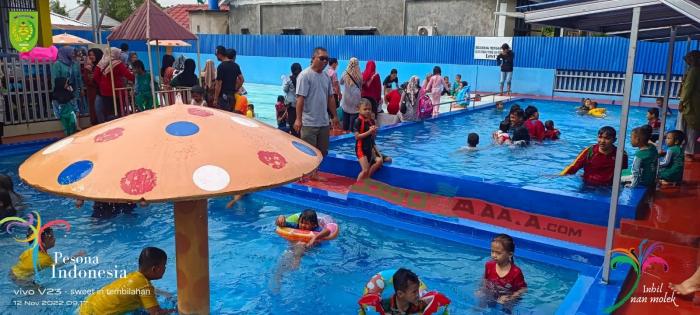 TEMBILAHAN, RIAUONE.COM - Ingin membawa anak berenang tapi takut tiket kolam renang mahal ? Tenang, Kolam renang Tanjung Uma pilihan yang cocok untuk orangtua membawa anak bermain sambil belajar berenang.