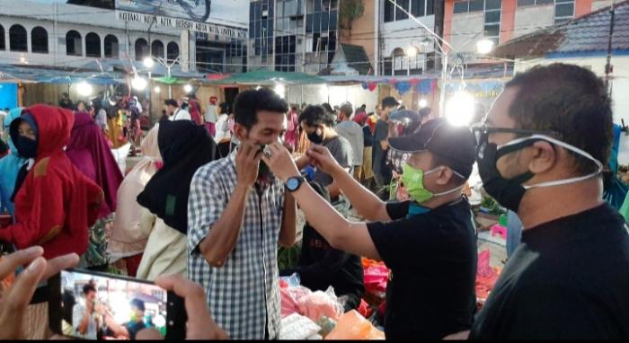 Satu persatu masker dibagikan kepada pedagang dan pengunjung pasar. Bahkan Dani M Nursalam langsung memakaikan masker kepada pedagang dan pengunjung yang tidak menggunakan masker. Hanya dalam sekejap, masker ludes diserbu pedagang dan pembeli.
