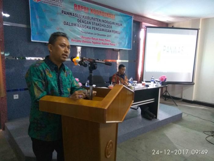 RIAUONE.COM, TEMBILAHAN - Dalam menghadapi Pemilihan Bupati (Pilbup) dan Gubernur Riau tahun 2018 serta Pemilihan Umum Legislatif tahun 2019, Panitia Pengawas Pemilihan Umum (Panwaslu) Kabupaten Indragiri Hilir melaksanakan Rapat Koordinasi dengan Stakeholder dalam rangka pengawasan Pemilu di Aula Hotel Dubest Tembilahan, Minggu, (24/12/2017).