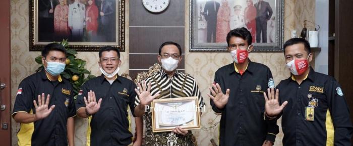 INHIL, TEMBILAHAN - Bupati Kabupaten Indragiri Hilir HM.Wardan menerima piagam penghargaan dari Dewan pimpinan Cabang (DPC) Gerakan Nasional Anti Narkotika (Granat) Kabupaten Inhil, Kamis (1/7/2021). Di rumah Dinas Bupati Jl.Kesehatan No.1 Tembilahan.