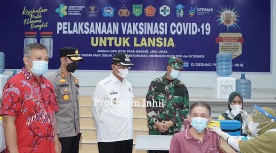 INHIL, TEMBILAHAN - Bupati Inhil H.M.Wardan meninjau langsung kegiatan Pelaksanaan penyuntikan Vaksin bagi Lansia untuk tahap pertama yang dilaksanakan di Gedung serba guna PSMTI Jalan Pekan Arba Tembilahan, Rabu (05/05/2021).