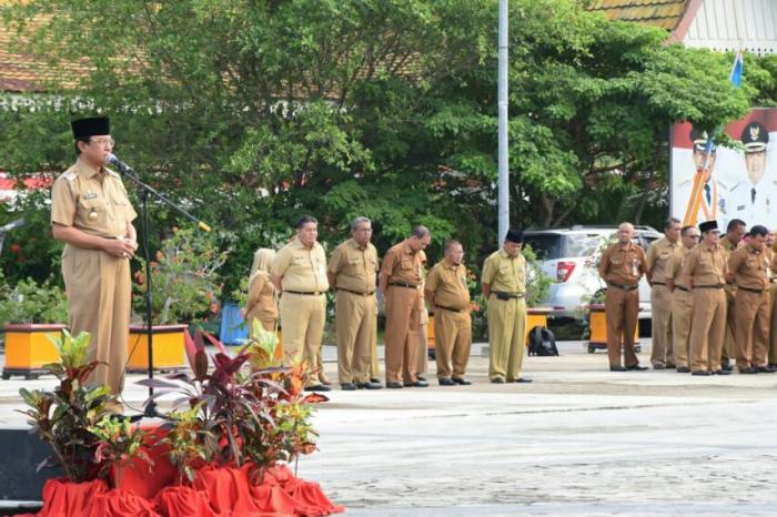 RIAUONE.COM, TEMBILAHAN - Bupati HM Wardan pimpin apel pagi dihari pertama masuk kerja pasca libur Idul Adha 1437 H di lingkungan Pemerintah Kabupaten Indragiri Hilir. Senin (13/9/2016).