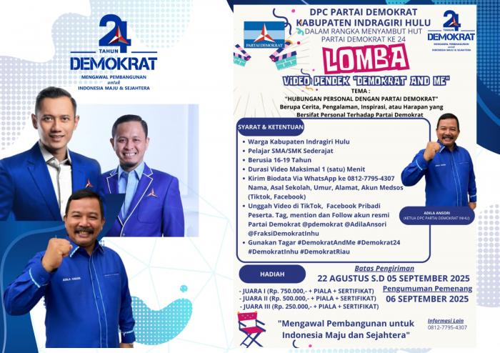RIAUONE, Inhu - Dalam rangka memperingati Hari Ulang Tahun (HUT) Partai Demokrat ke-24 yang jatuh pada 9 September 2025, Dewan Pimpinan Cabang (DPC) Partai Demokrat Kabupaten Indragiri Hulu (Inhu)-Riau, menggelar lomba video pendek dengan tema "Hubun