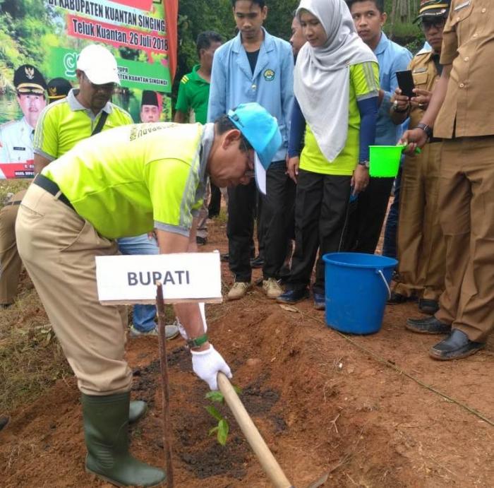 KUANSING,- Sukseskan Gerakan Lestari Alam Terpadu Komunitas Masyarakat Peduli Sungai Dan Lingkungan (Geliat Kampung) kegiatan Bidang SDA Dinas PUPR, Bupati H Mursini bersama Mahasiswa KKN UNRI gelar penanaman seribu pohon di hulu sungai petapahan gunung toar, Selasa pagi (24/07/2018).