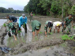 RIAUONE.COM, KUANSING, ROC, - Jajaran Koramil 02/Kuantan Tengah melaksanakan tanam padi perdana di Lahan Pertanian Kampungbaru Sentajo Kecamatan Kuantan Tengah, Kabupaten Kuantan Singingi (Kuansing), Riau, Kamis (17/12).