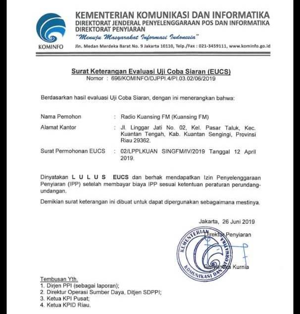 "Tim evaluasi Balai Monitoring (Balmon) dan KPID Riau tersebut telah memberikan Rekomendasi dan menyatakan Lulus atas ijin siaran RPD Kuansing, selama evaluasi uji coba siaran (EUCS), sesuai surat Keputusan Kementerian Kominfoss RI tertanggal 26 Juni 2019 Lembaga Penyiaran Publik Lokal (LPPL) atau dikenal RPD Kuansing FM meraih predikat LuLus," jelas Mulyadi.