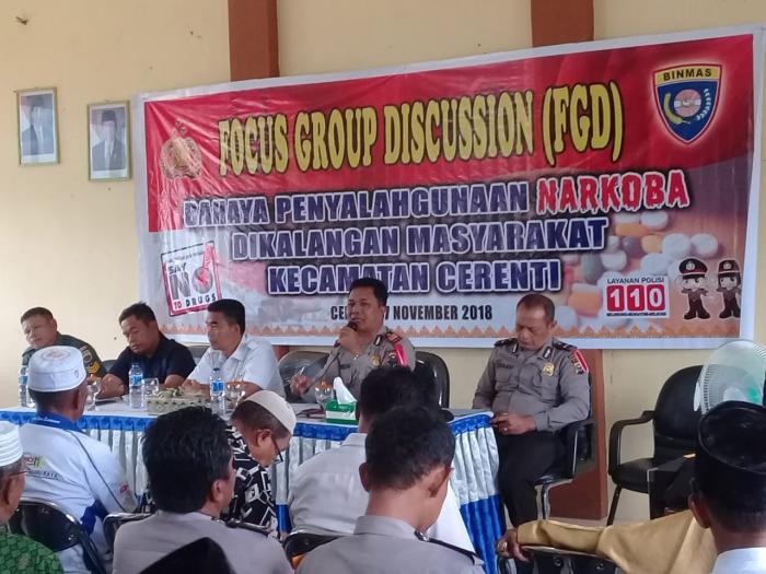 KUANSING,- Kepala Kepolisian Sektor (Kapolsek) Cerenti adakan Focus Group Discusion (FGD) Rabu (7/11/2018) bertempat di Aula Kantor Camat Cerenti, " Tema Bahaya Penyalahgunaan Narkoba di Kalangan Masyarakat Kecamatan Cerenti.
