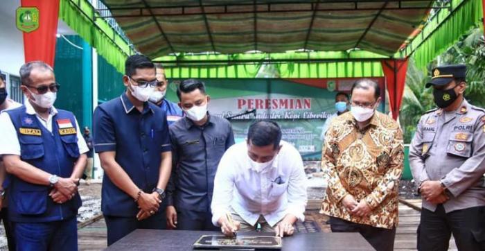 MERANTI, Kedaburapat, - Bupati Kabupaten Kepulauan Meranti meresmikan Operasional Sentra Kopi Liberika Meranti di Desa Kedaburapat, Selasa (5/10/201)