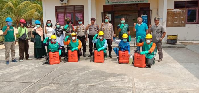 Pelalawan RS- PT Sari Lembah Subur ( SLS) Bersama, Pemerintahan Kecamatan Kerumutan, Kapolsek Kerumutan menyemprotkan Disenfektan ke sejumlah fasilitas umum yang ada di wilayah Kerumutan dan Pangkalan Lesung.