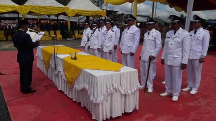 PELALAWAN, RIAU, - Pelantikan 12 Kepala Desa se Kecamatan Pangkalan Kuras Kabupaten Pelalawan yang sempat tertunda karena adanya perselisihan dan laporan pelanggaran di Pilkada serentak gelombang ke II tahun 2018 akhirnya dapat dilaksanakan Senin (03/12) di Desa Palas Kecamatan Pangkalan Kuras Kabupaten Pelalawan Riau oleh Bupati Pelalawan HM Harris.