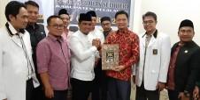Setelah memberikan sambutannya, singkatnya, Zukri Misran menyerahkan berkas formulir pendaftaran yang diterima langsun ketua DPD PKS Pelalawan Sukaeni,SP. (clc/roc)
