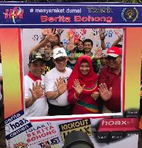 DUMAI, - Bupati H.M.Harris dan Masyarakat Ikuti Jalan Sehat Puncak HPN di Dumai, Bupati Pelalawan H.M.Harris saat akan membubuhkan cap tangan HPN Kick Out Hoax .Minggu (07/05/2017)