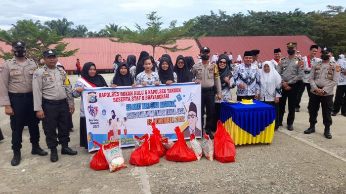 Rokan Hulu, RiauOne.Com - Kapolsek Tandun Iptu Ulik Iwanto S.H pada peringatan Hari Guru Nasional (HGN) 25 November 2022, melaksanakan kegiatan penyerahan bantuan sosial di SMPN 5 Tandun, Desa Koto Tandun, Kecamatan Tandun, Rokan Hulu.