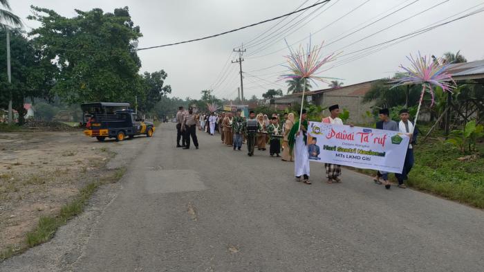 Rokan Hulu, RiauOne.Com - Personil Polsek Kabun melaksanakan kegiatan pengamanan Pawai Ta'aruf dalam rangka Hari Santri Nasional Tahun 2022 oleh Siswa/Siswi MTs. LKMD desa Giti, Kecamatan Kabun pada hari Sabtu (29/10/2022) sekira pukul 07.30 WIB.
