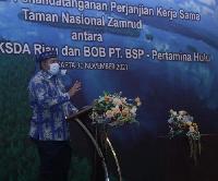 RIAUONE.COM,SIAK- Bupati Siak Alfedri menyaksikan penandatanganan Perjanjian Kerja Sama (PKS) pengelolaan Taman Nasional Zamrud, antara BOB PT. BSP - Pertamina Hulu, dan Balai Besar Konservasi Sumber Daya Alam (BBKSDA) Riau, dilaksanakan di Ballroom II, L