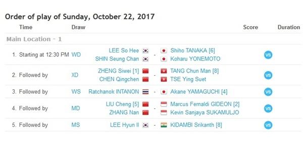 Nomor tunggal putri akan main di partai ketiga dengan mempertemukan Akane Yamaguchi vs Ratchanok Intanon yang kemudian dilanjutkan pertandingan Kevin Sanjaya/Marcus Fernaldi VS Zhang Nan/Liu Chen.