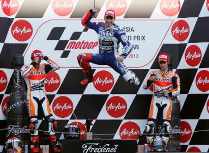 Lorenzo terus menjaga asanya mempertahankan titel juara dunia usai menjadi pebalap pertama yang melintasi garis finis di Motegi, Ahad (27/10/13) siang WIB. Di belakangnya tepat ada Marquez yang kini jadi pesaingnya di klasemen.